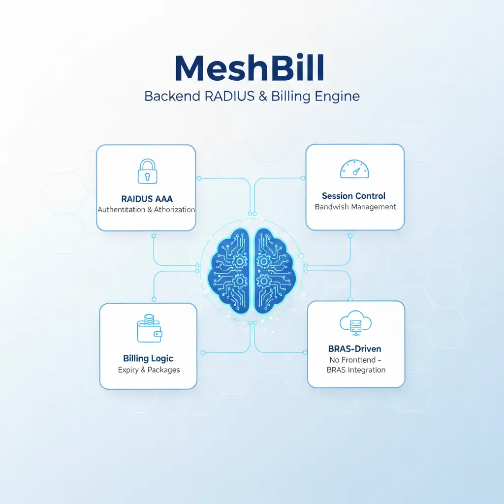MeshBill is a backend-only RADIUS and billing engine that serves as the authentication and financial brain of an ISP network. It works silently in the background and integrates directly with your BRAS.