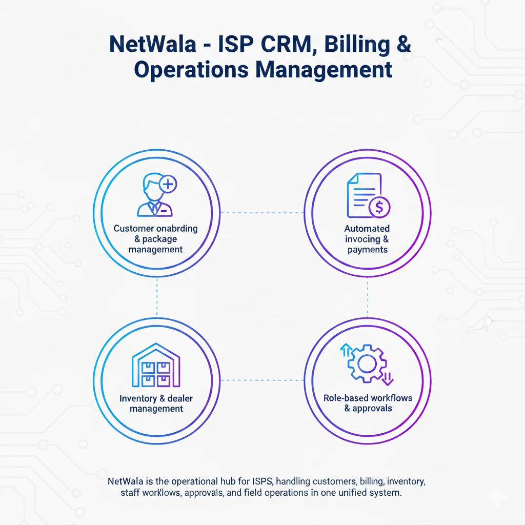 NetWala is the operational hub for ISPs, handling customers, billing, inventory, staff workflows, approvals, and field operations in one unified system.